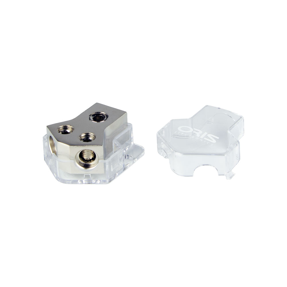 Высококачественный распределитель питания для подключения автомобильных усилителей мощности, с входными терминалами 0Ga, выходными терминалами 4Ga и винтовыми зажимами.