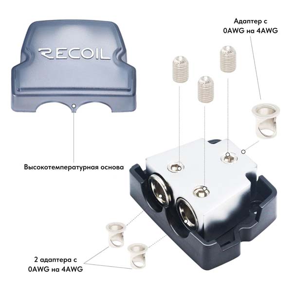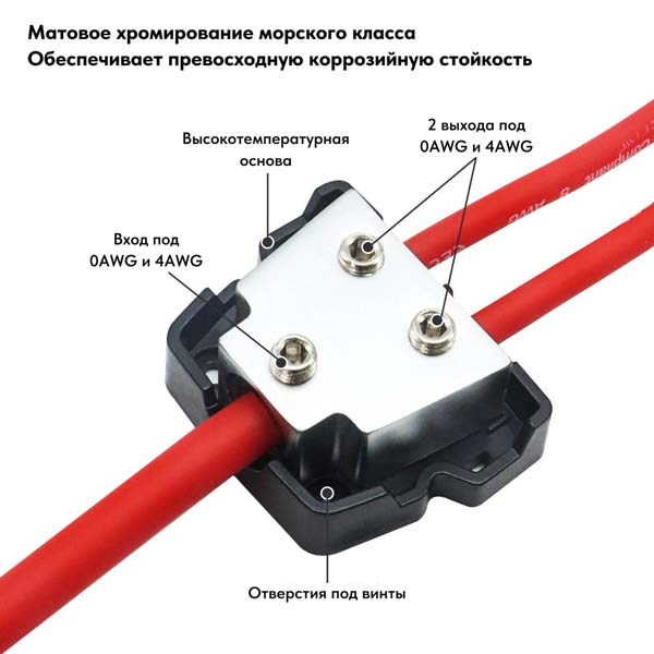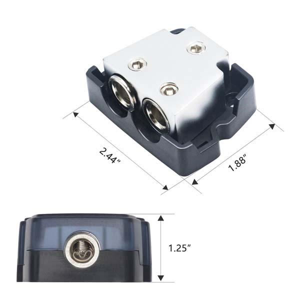 Высокопроизводительный 2-канальный блок распределения питания автомобильной аудиосистемы 1 х 0/2/4 AWG на входе, 2 х 0/2/4 AWG на выходе