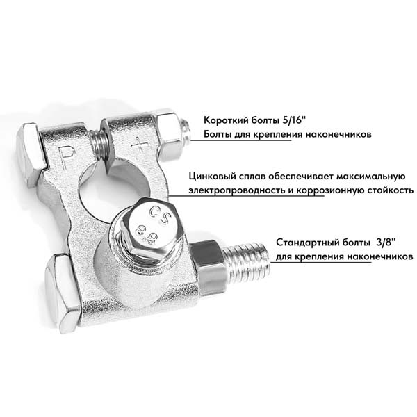 Стандартный болт диаметром 3/8» дюйма и короткий болт диаметром 5/16» дюйма к которым можно подключить с пару кольцевых клемм.
