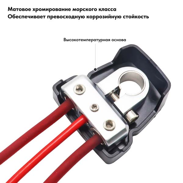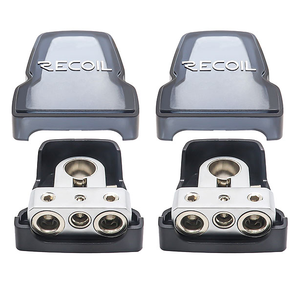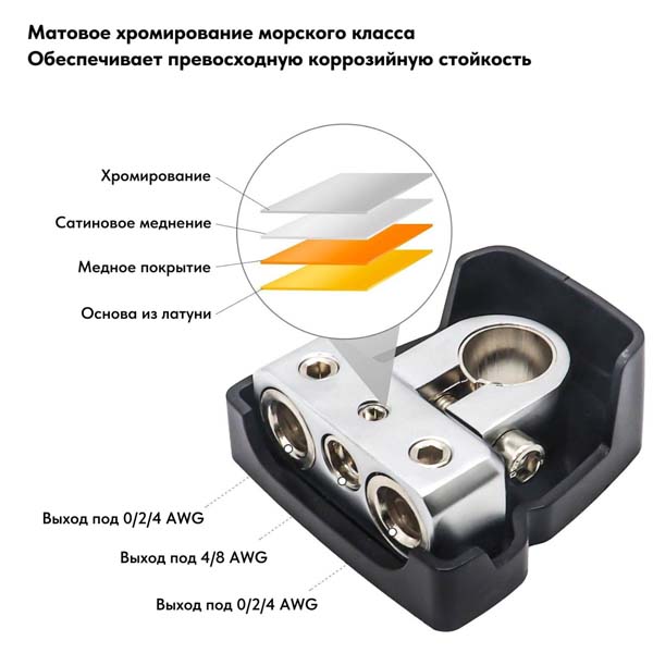 Каждая клемма аккумулятора разделяет соединение на три выхода: два выхода 0/2/4 AWG и один выход 4/8 AWG.