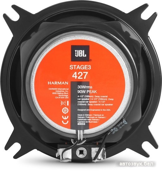 Динамики JBL Stage 3 — это запатентованные технологии, дизайн мирового класса и профессиональный звук JBL, воплощенные в мощной линейке автомобильных акустических систем. Делая акцент на звучании и подгонке, они предлагают качество звука, которому нет равных. Дизайн DCR с сопротивлением 2 Ом извлекает каждый ватт мощности из усилителя или установки, обеспечивая высокую выходную мощность и отличное воспроизведение басовых частот запатентованных низкочастотных динамиков Plus One™. Наше скрупулезное тестирование надежности на уровне производителя гарантируют непревзойденное звучание JBL и всплеск адреналина.Общая информация Дата выхода на рынок 2018 г. Модель товара Информация 100 мм двухполосная коаксиальная акустическая система для автомобиля Описание Цвет черный Технические характеристики Тип коаксиальная АС Форма диффузора круглая Мощность максимальная 90 Вт Мощность номинальная 30 Вт Диапазон частот 75 — 20 000 Гц Чувствительность 90 дБ Сопротивление 3 Ом Количество полос 2 Установочные размеры Типоразмеры 4" - Отзывы
