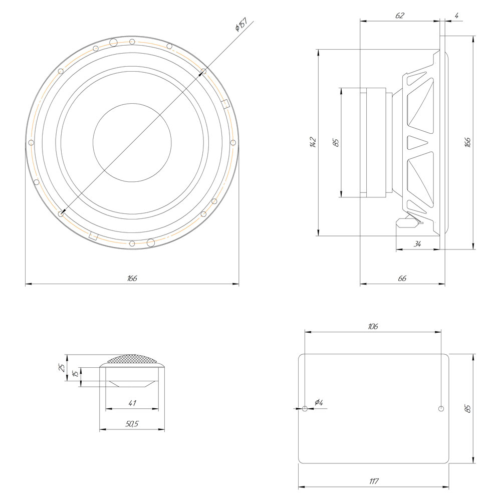 В мидбасовых динамиках использованы лёгкие и жёсткие алюминиевые диффузоры и безрезонансные центрирующие шайбы. Их особенность – абсолютно ровная фазовая и амплитудная линейность в области нижних и средних частот – самой ответственной с точки зрения передачи основных тонов большинства инструментов и вокала.