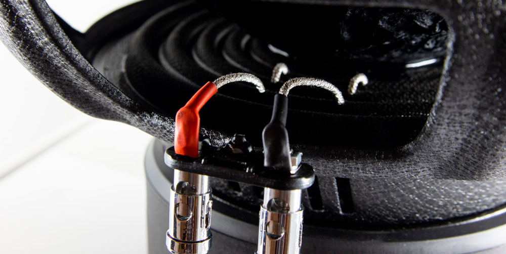 Звуковая катушка имеет двойную обмотку, номинальный импеданс сабвуфера 2+2 Ом. Вы можете соединить обмотки параллельно и получить импеданс 1 Ом, или последовательно для получения импеданса 4 Ом. Такая гибкость даёт возможность строить басовое звено на одном или нескольких динамиках, выбирая нужный вариант включения для оптимального согласования с выбранным вами усилителем.