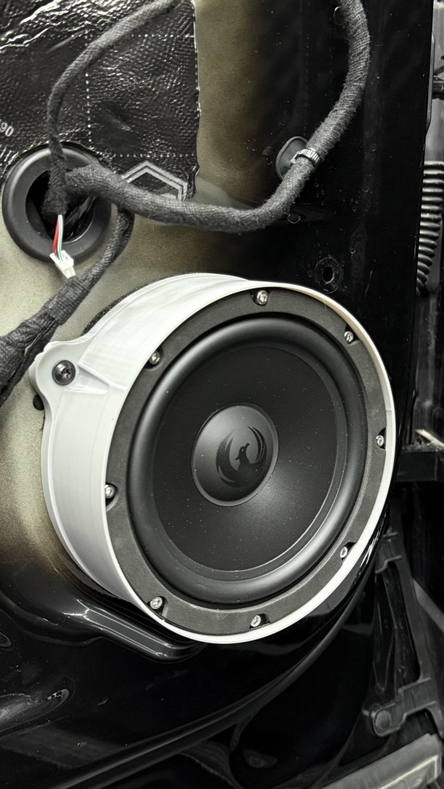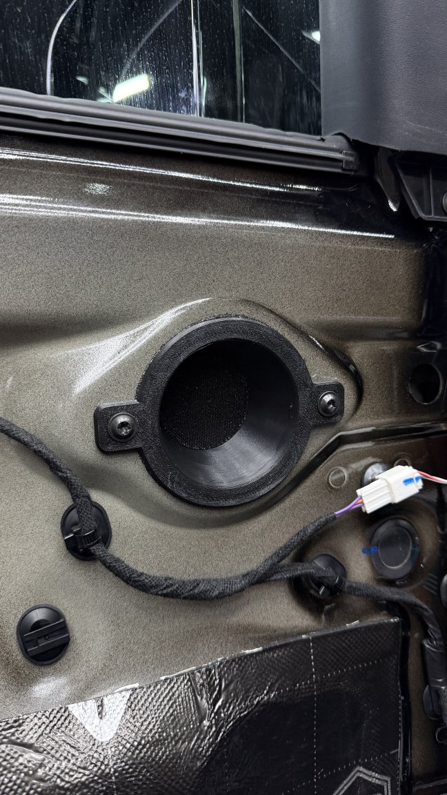 Для акустики изготовлены собственные проставочные кольца: мы смоделировали и напечатали их под конкретные места установки. Это даёт точную ось динамика, правильный прижим и предсказуемую работу в двери — то, что на практике важнее маркетинговых обещаний.