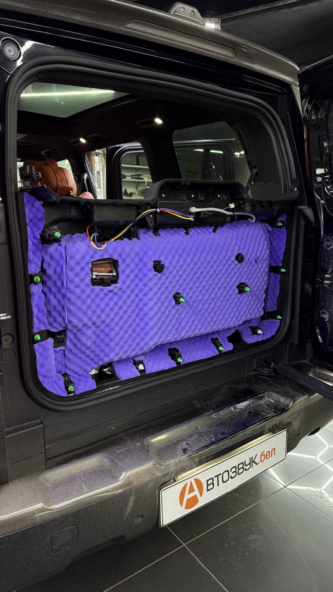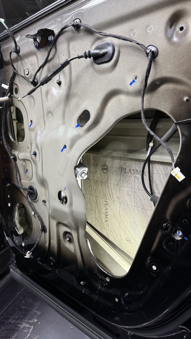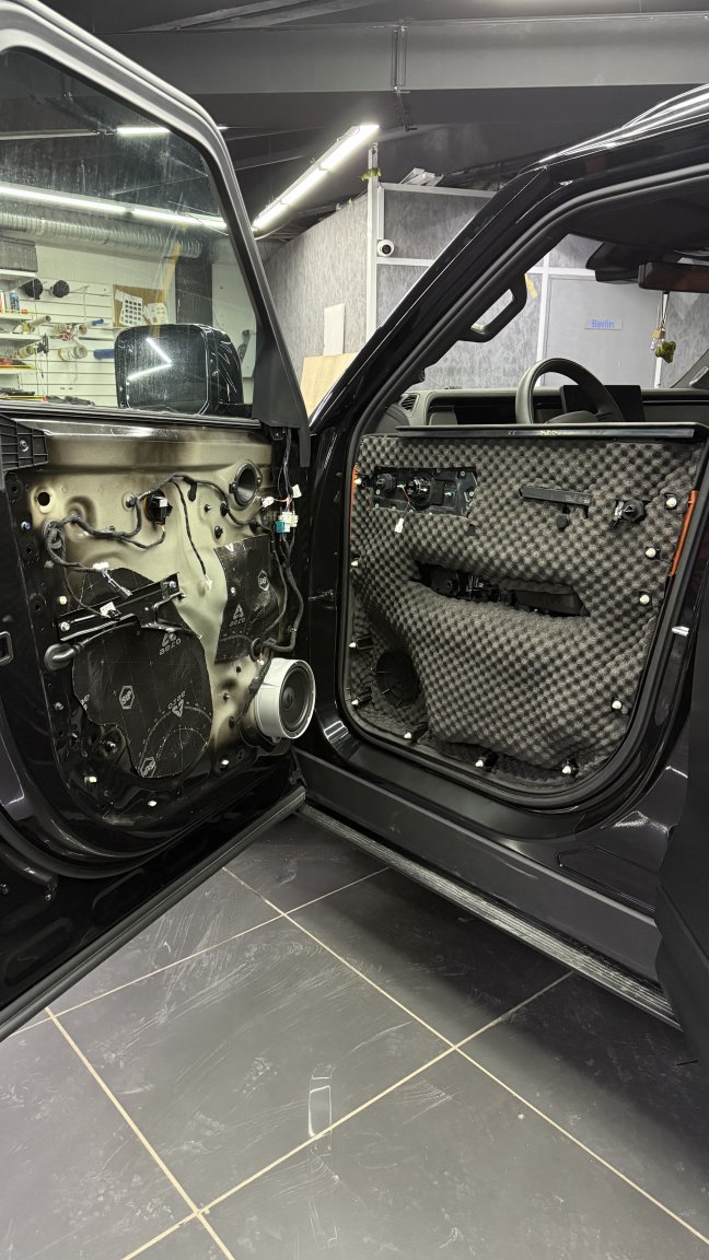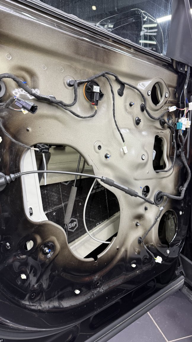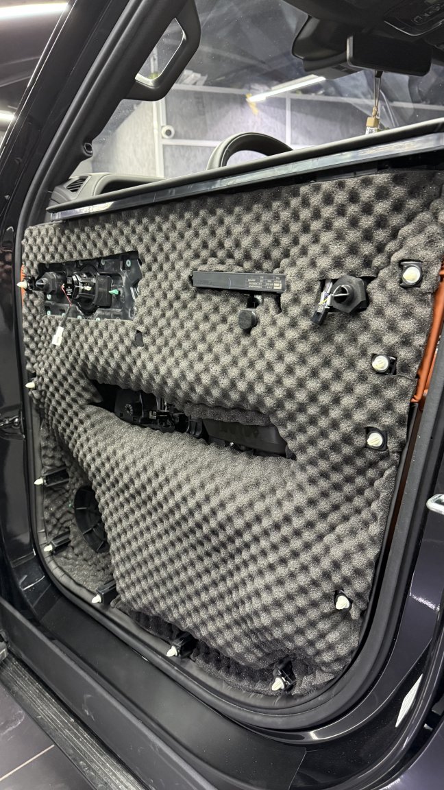 Мы сделали полную шумоизоляцию премиальными материалами STP по смысловым зонам кузова: демпфирование жёстких панелей, развязка резонансов, поглощение пустот и работа с трактами, через которые в салон проходит дорога. Задача этапа простая по смыслу и сложная по исполнению: снизить фон, чтобы дальнейшая акустика не боролась с шумом, а раскрывалась.
